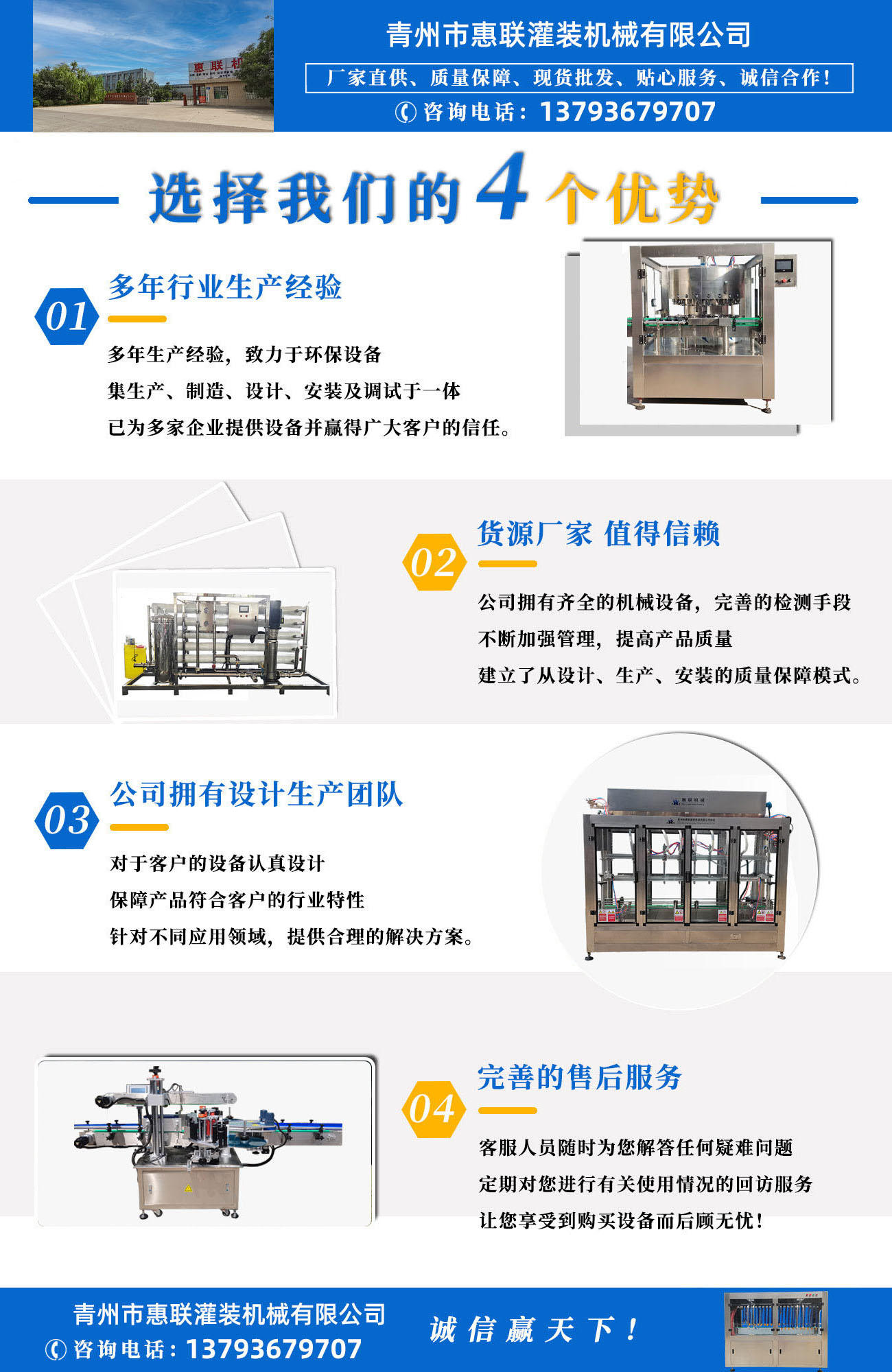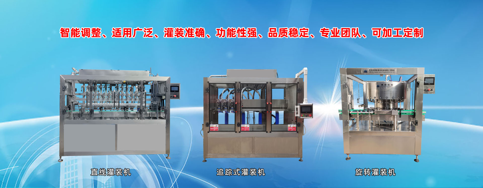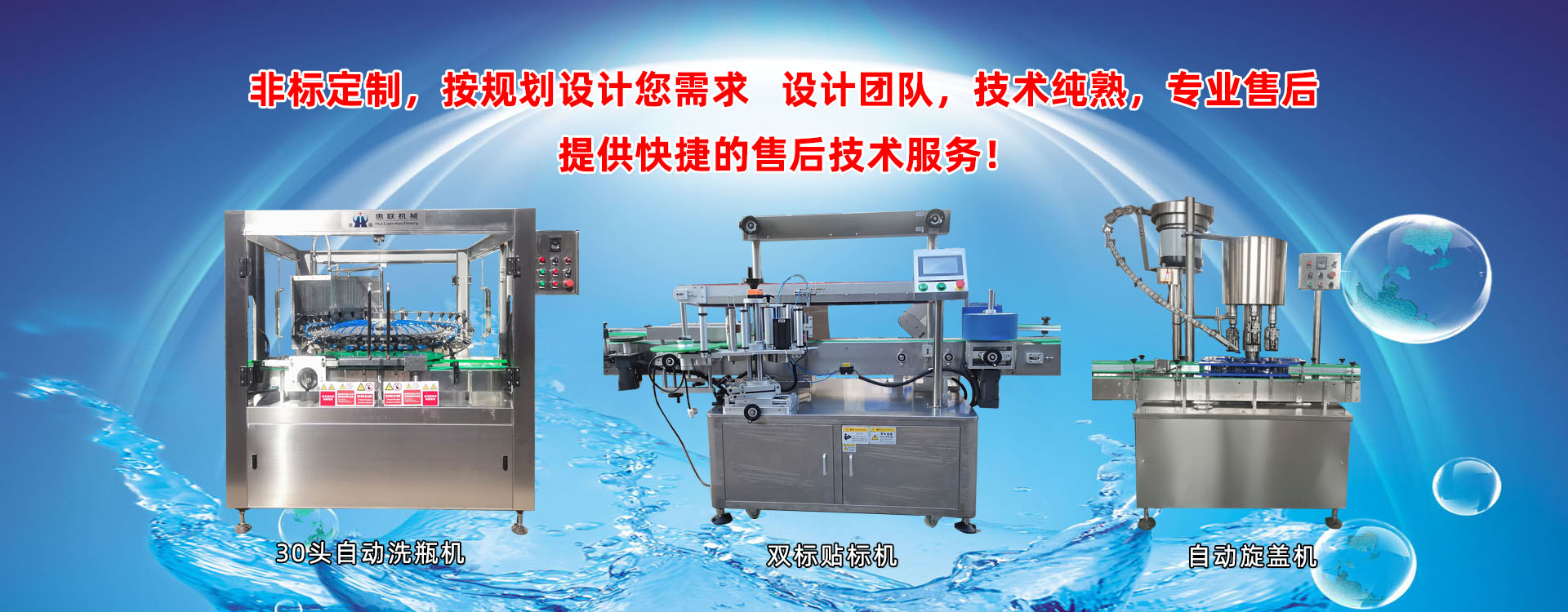青州市惠聯(lián)灌裝機械有限公司是一家集生產(chǎn)研發(fā)、銷售、服務于一體的液體灌裝成套設備生產(chǎn)企業(yè),可根據(jù)廠家要求設計合理液體灌裝生產(chǎn)線,為用戶提供技術咨詢、設計工藝、場區(qū)平面布置、工藝改造、設備安裝調(diào)試等完善服務。 公司生產(chǎn)制造各種類型液體灌裝機、過濾機,水處理設備及液體灌裝成套設備。主要產(chǎn)品有:白酒、葡萄酒、黃酒等酒水灌裝機、食用油、機油、潤滑油等油類灌裝機、醬油醋、老抽、生抽等調(diào)味品灌裝機、防凍液、玻璃水灌裝機、酒精、84消毒液灌裝機、車用尿素灌裝機、口服液灌裝機、洗滌劑灌裝機等多種液體、膏體灌裝設備,全自動/半自動灌裝機型號多,規(guī)格全,洗瓶機、瓶子封口機、打塞機、熱縮機、瓶子烘干機、貼標機、噴碼機、輸送線、裝箱機、水處理設備等全套生產(chǎn)線相關配套設備齊全,自產(chǎn)自銷,一站式購齊,售后無憂。